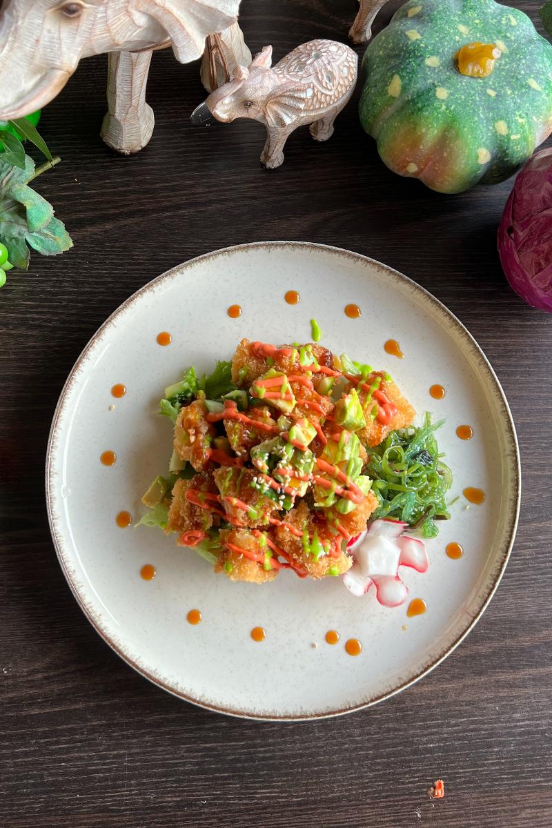 (H,SK,SO,E,F,SE) Innbakt laks med sjøgress, avocado, chilimajones wasabisaus og teriyakisaus