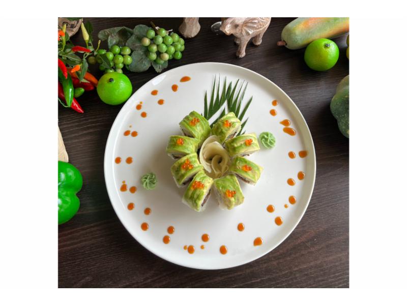 (SK,SO,SE) Fritert sandkrabbe, agurk, topping med avocado og teriyakisaus