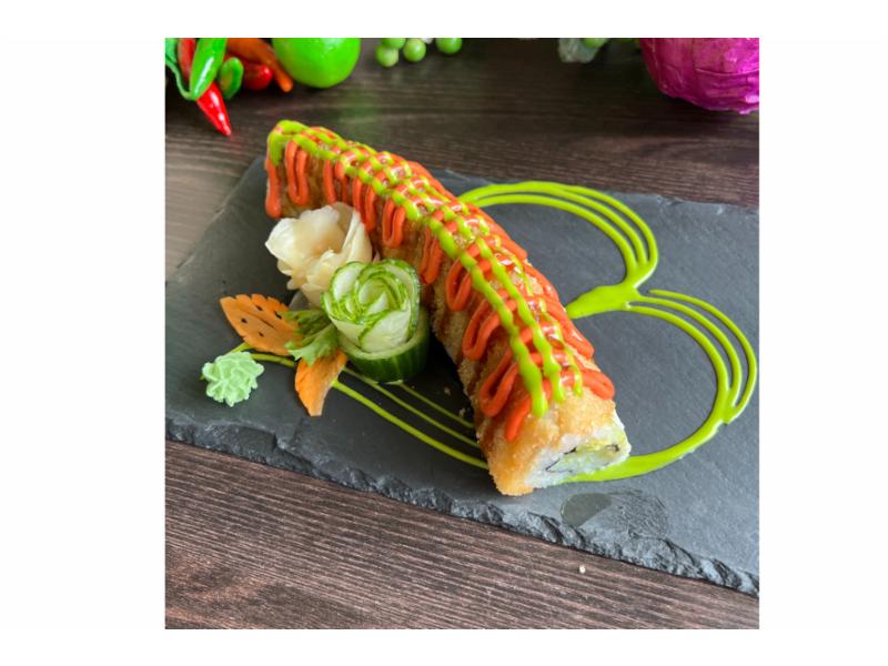 (H,E,SO,SE) Avocado og agurk, topping med fritert hvitfisk, chilimajones, teriyakisaus, wasabisaus