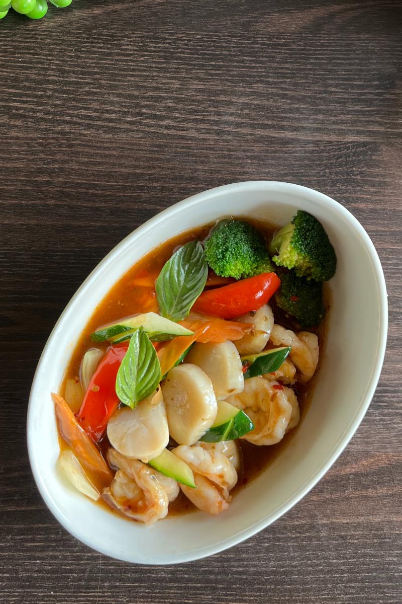 (SK,F,P,SO,SE) Woked scampi og kamskjell m/chilipest saus og grønnsaker