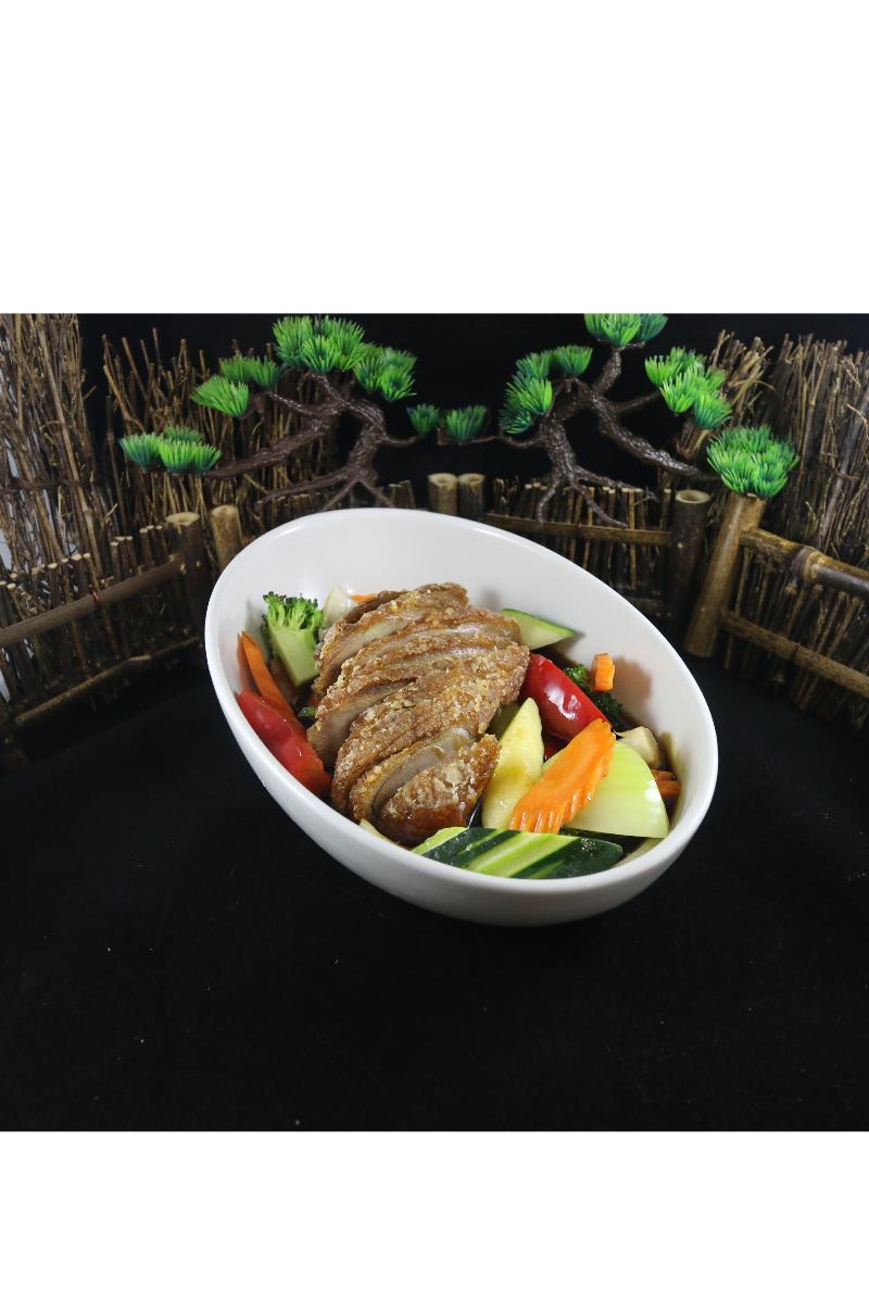 (H,SK,F,SO,SE) Stekt and med grønnsaker og husets teriyakisaus